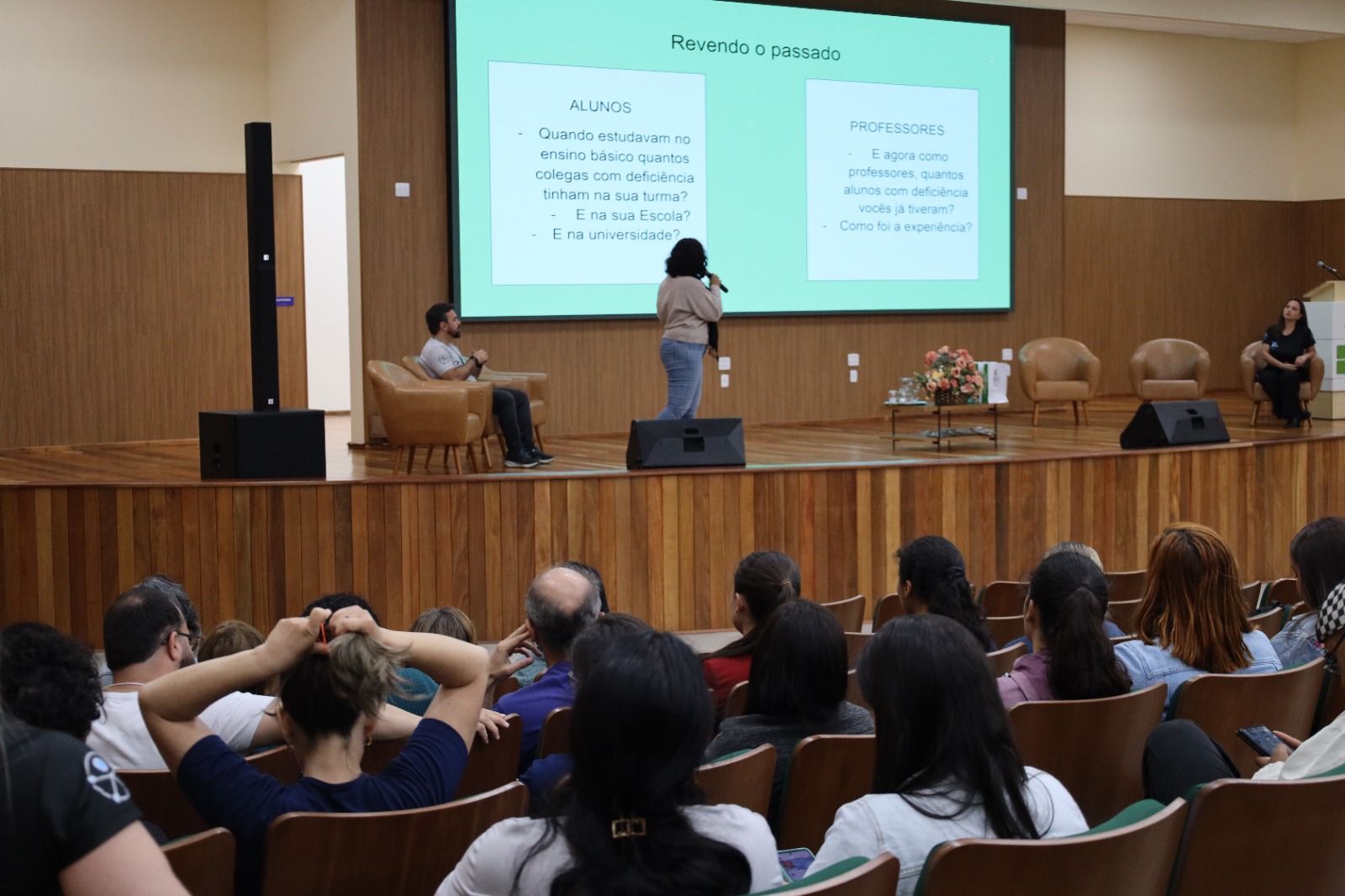 A professora Lia Polegato, juntamente com Sérgio Garcia e Sara Mateus, abriram o ciclo de debates destacando a importância da extensão inclusiva e do diálogo com a comunidade externa. Sua fala enfatizou que práticas inclusivas ganham força quando são construídas com as pessoas, e não para elas — valorizando a escuta ativa e o protagonismo dos sujeitos com deficiência nos processos de transformação social.