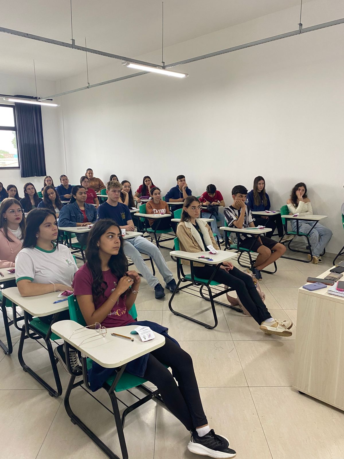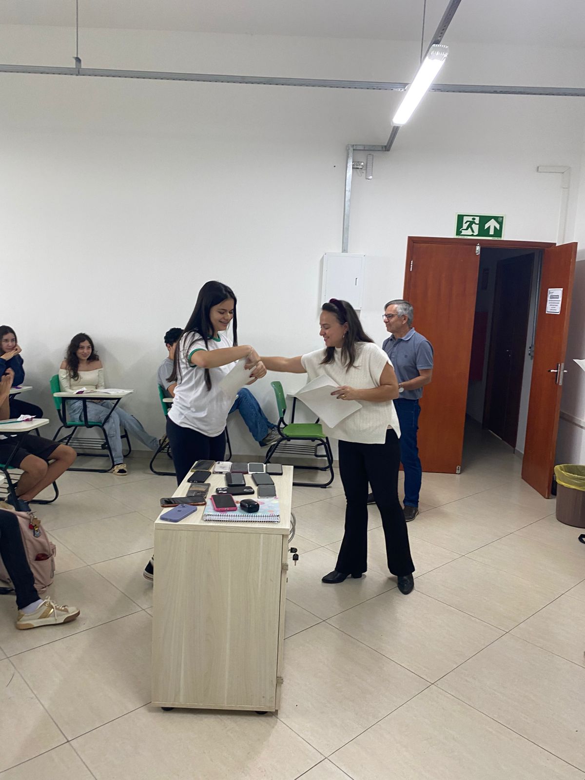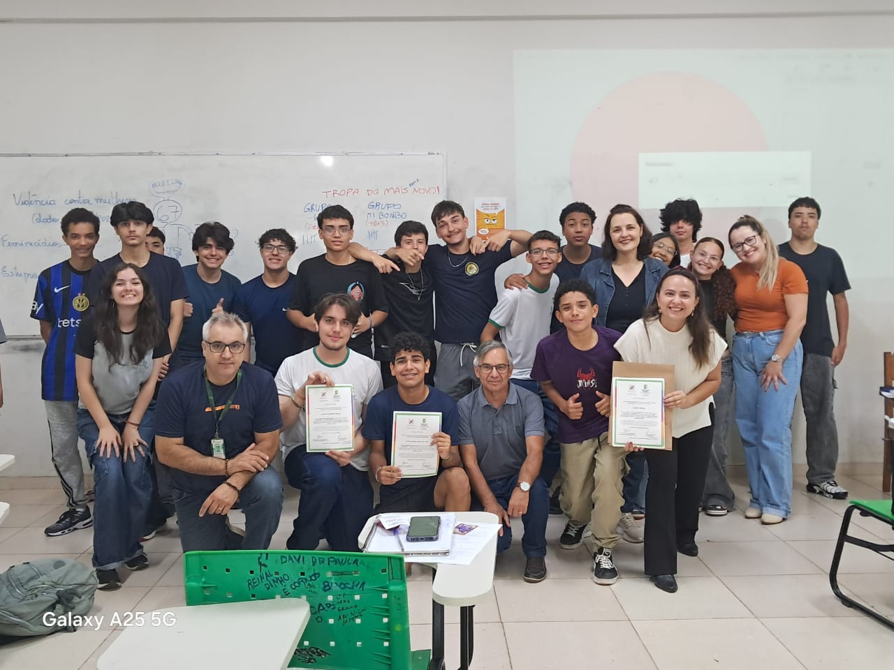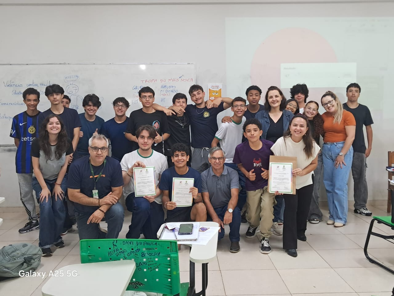 Como forma de reconhecimento, os estudantes que participaram de 80% ou mais das oficinas em todos os bimestres receberam certificados de participação. A entrega foi realizada diretamente nas salas de aula, com a presença dos professores responsáveis pelas oficinas, da Coordenadora Geral de Ensino e do Diretor de Ensino do campus, Hugo Baldan Júnior, que percorreram as oito turmas para celebrar o encerramento da proposta junto aos estudantes.