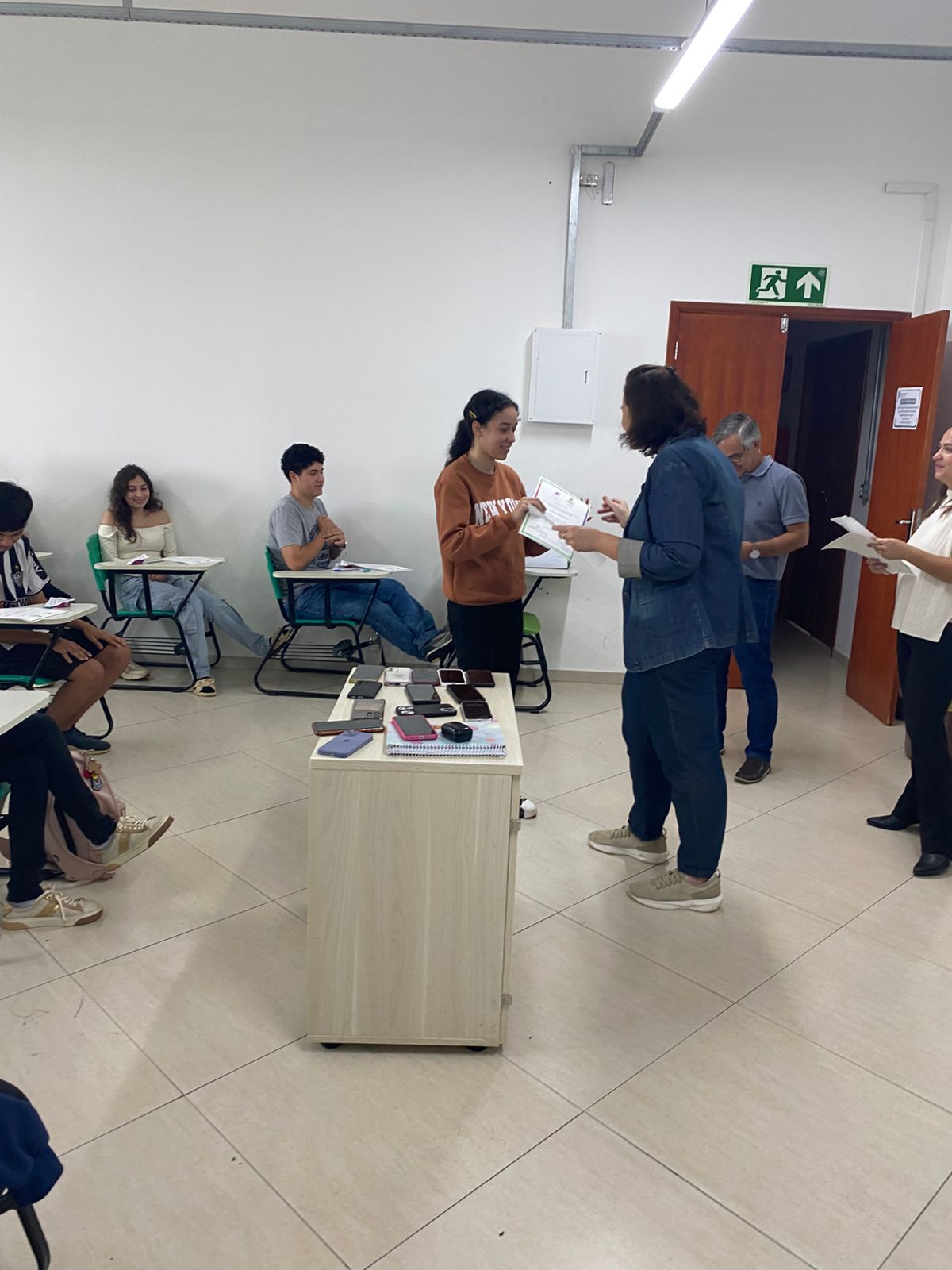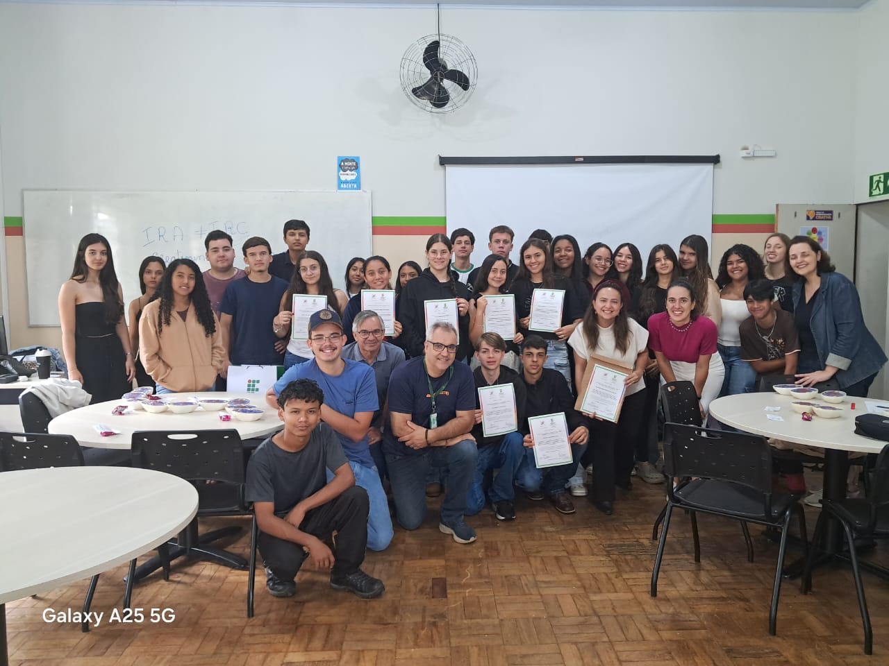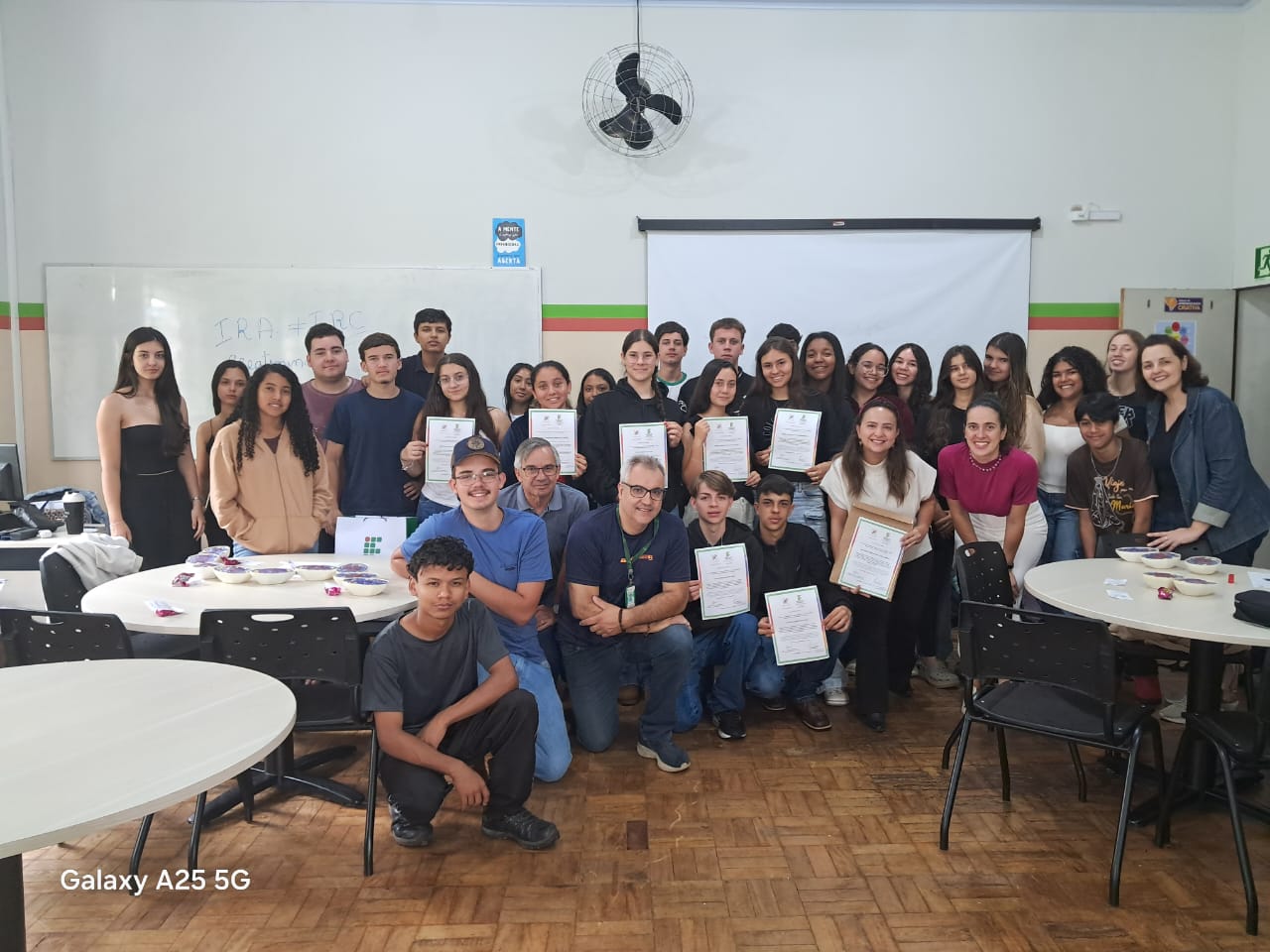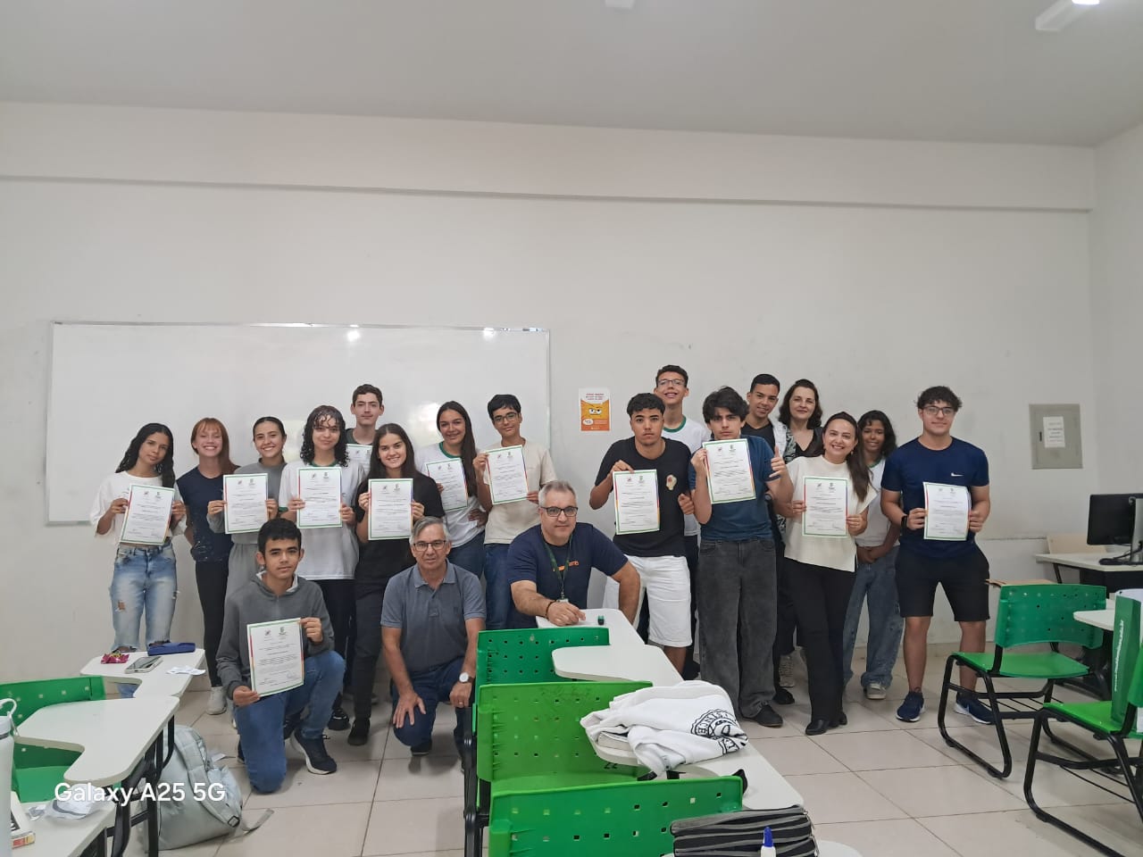 Como forma de reconhecimento, os estudantes que participaram de 80% ou mais das oficinas em todos os bimestres receberam certificados de participação. A entrega foi realizada diretamente nas salas de aula, com a presença dos professores responsáveis pelas oficinas, da Coordenadora Geral de Ensino e do Diretor de Ensino do campus, Hugo Baldan Júnior, que percorreram as oito turmas para celebrar o encerramento da proposta junto aos estudantes.